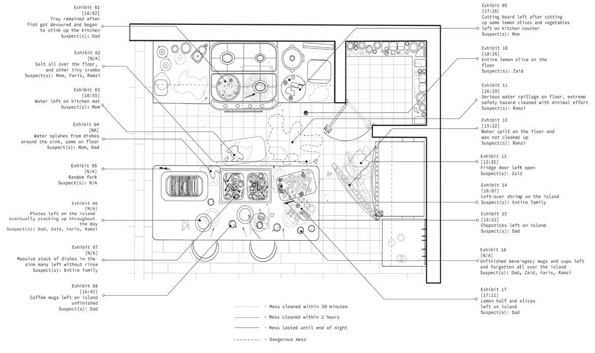 Faris Itum, of Ottawa, made this drawing in STUDIO FIRST and included it in his M.Arch application portfolio. Kitchen CSI documents the aftermath of big family meals as if they were crime scenes — tracing who left which mess.